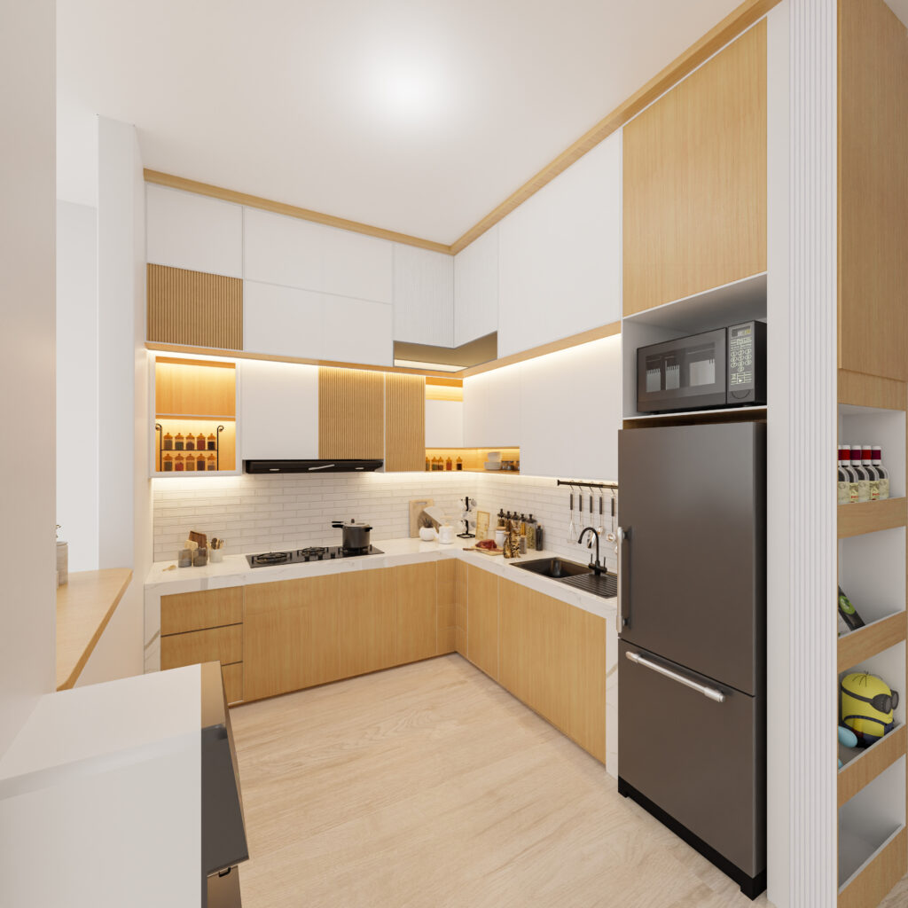 - Lemari built-in warna kayu terang