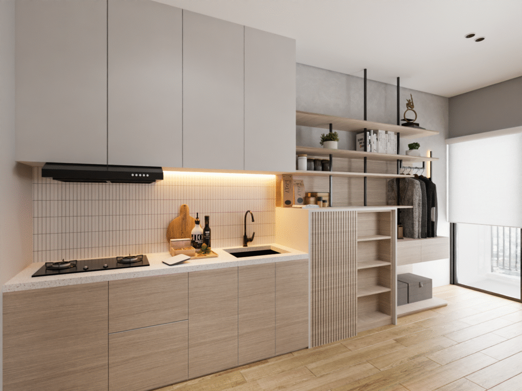 Dapur dibagi ke dalam zona preparation, cooking, dan cleaning untuk mendukung aktivitas memasak yang efisien.
